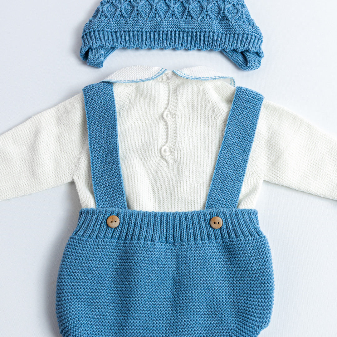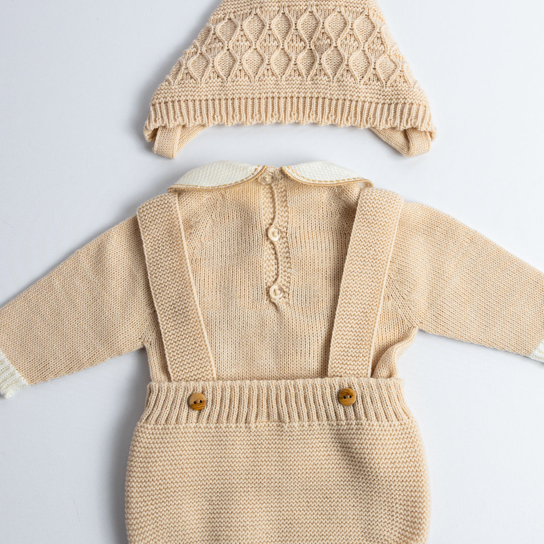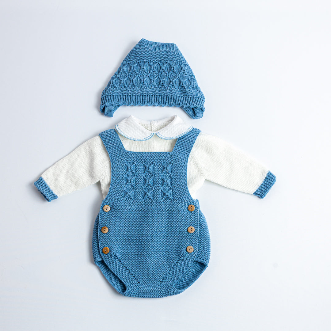 Conjunto de tres piezas tejido en punto bobo, compuesto por jersey de manga larga con cuello bebé, ranita con tirantes cruzados y capota a juego. El delantero luce un delicado calado con ochos, acompañado de botones de madera en los laterales, que aportan un toque artesanal y elegante. Disponible en azul clásico y en beige almendra, ambos tonos atemporales y fáciles de combinar.