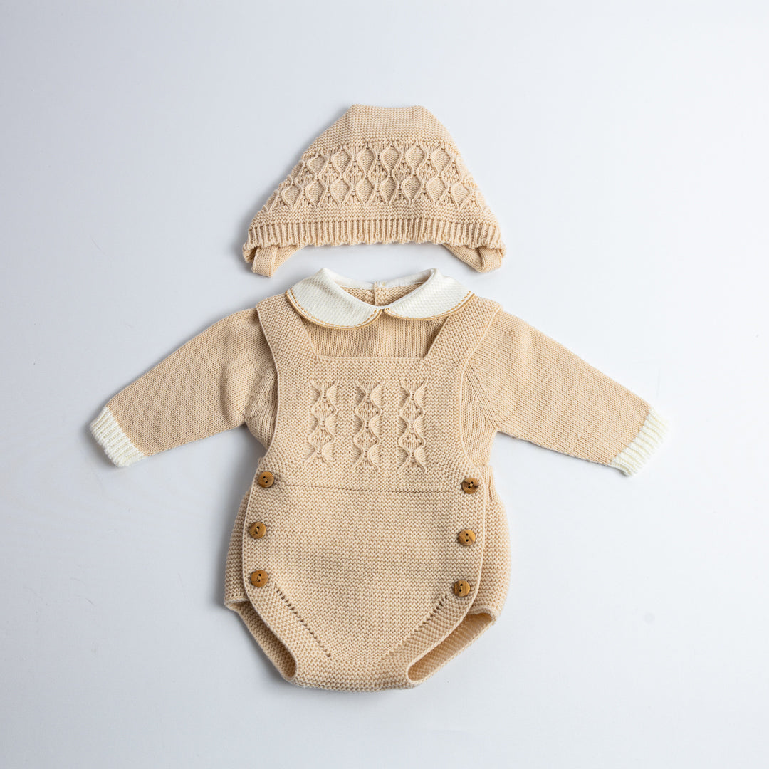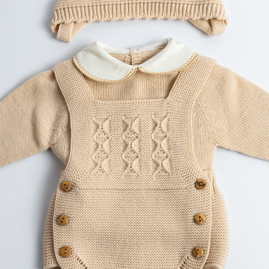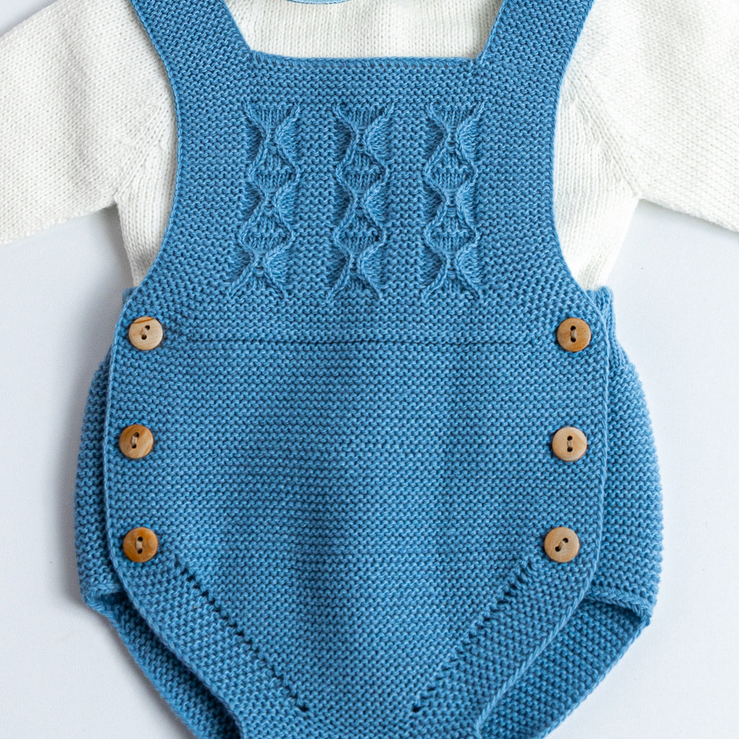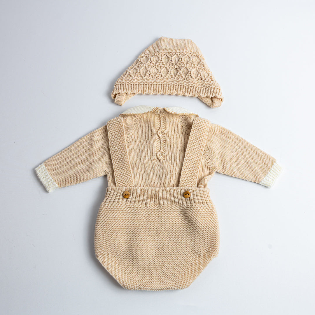 Conjunto de tres piezas tejido en punto bobo, compuesto por jersey de manga larga con cuello bebé, ranita con tirantes cruzados y capota a juego. El delantero luce un delicado calado con ochos, acompañado de botones de madera en los laterales, que aportan un toque artesanal y elegante. Disponible en azul clásico y en beige almendra, ambos tonos atemporales y fáciles de combinar.