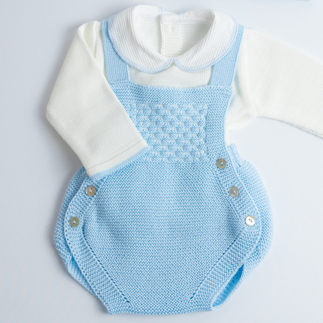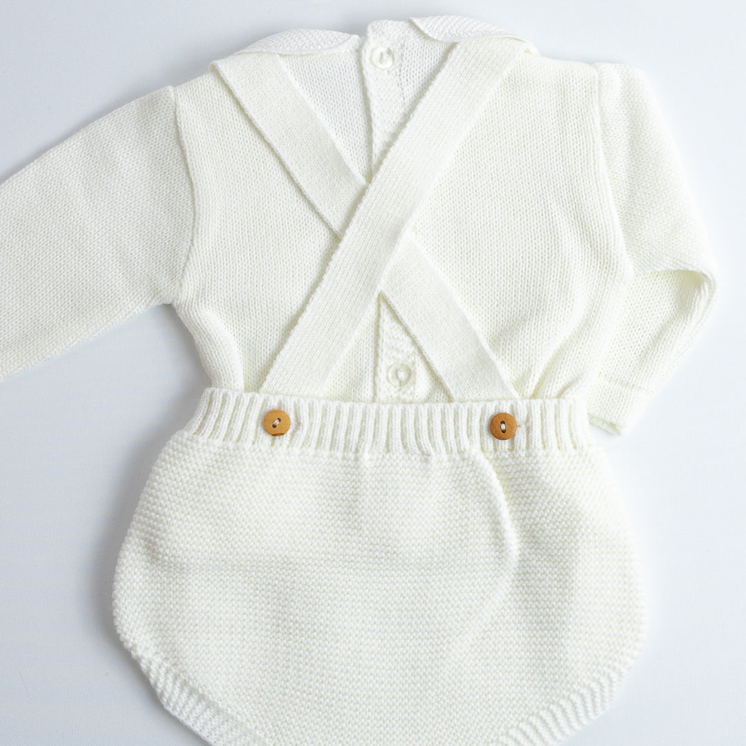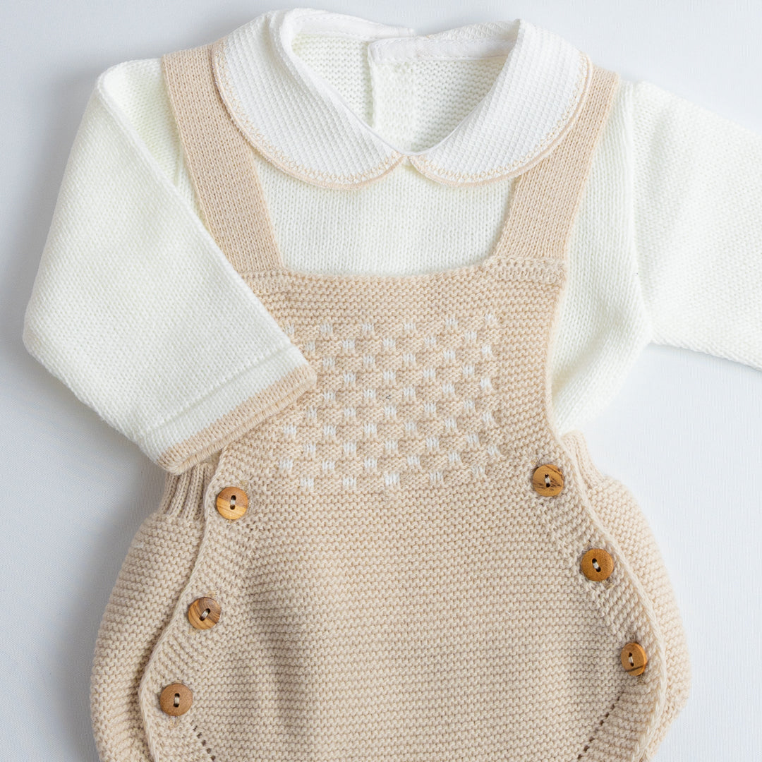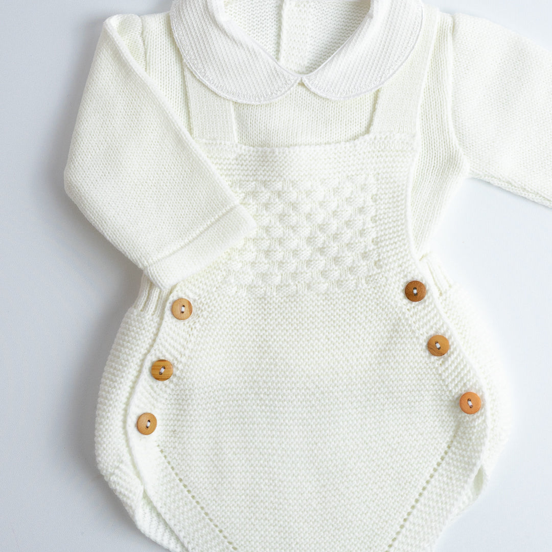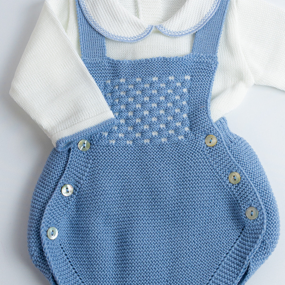 El Set de Ranita Tejida con Blusa "Pequeño Clásico" está diseñado para darle a tu bebé un look distinguido y cómodo. La ranita de tirantes cruzados en la espalda con botones laterales es práctica y fácil de poner, mientras que el jersey de manga larga con cuello bebé aporta el toque clásico de la moda infantil española.