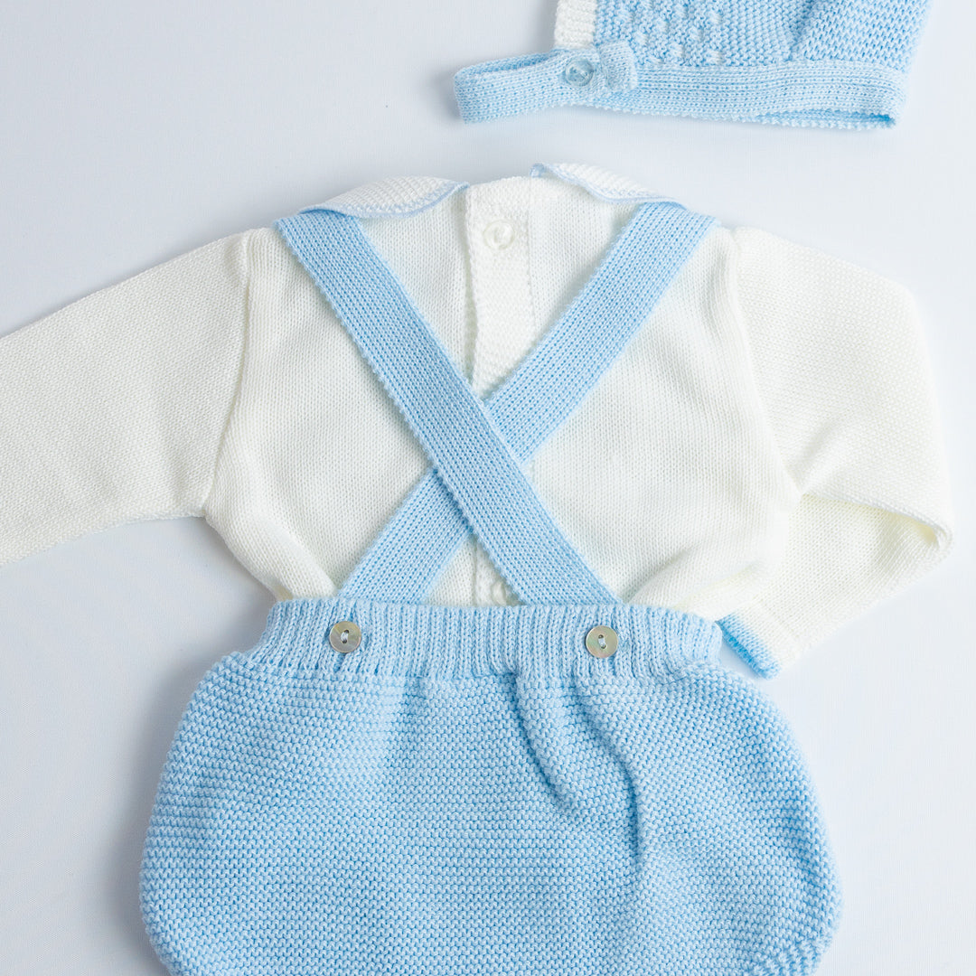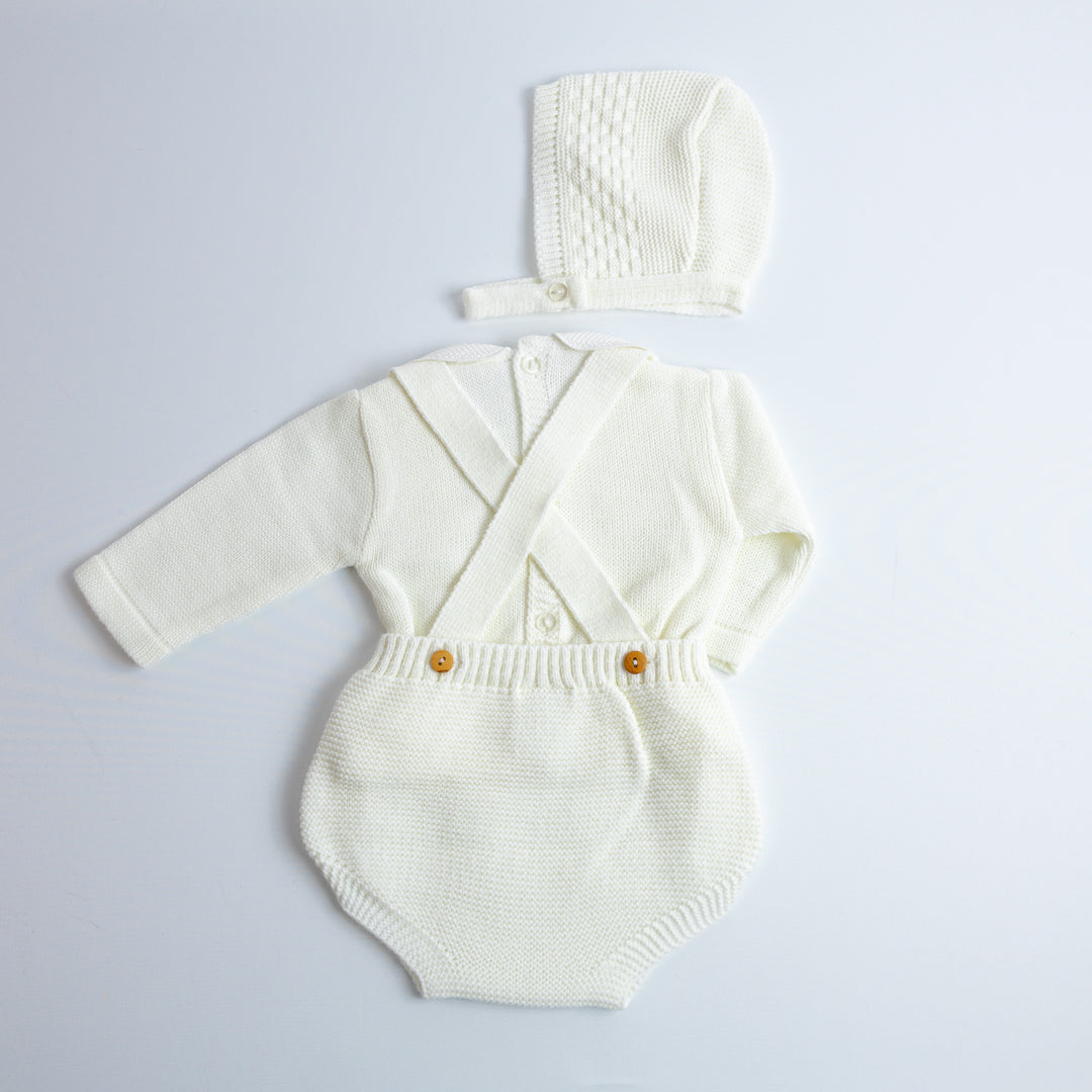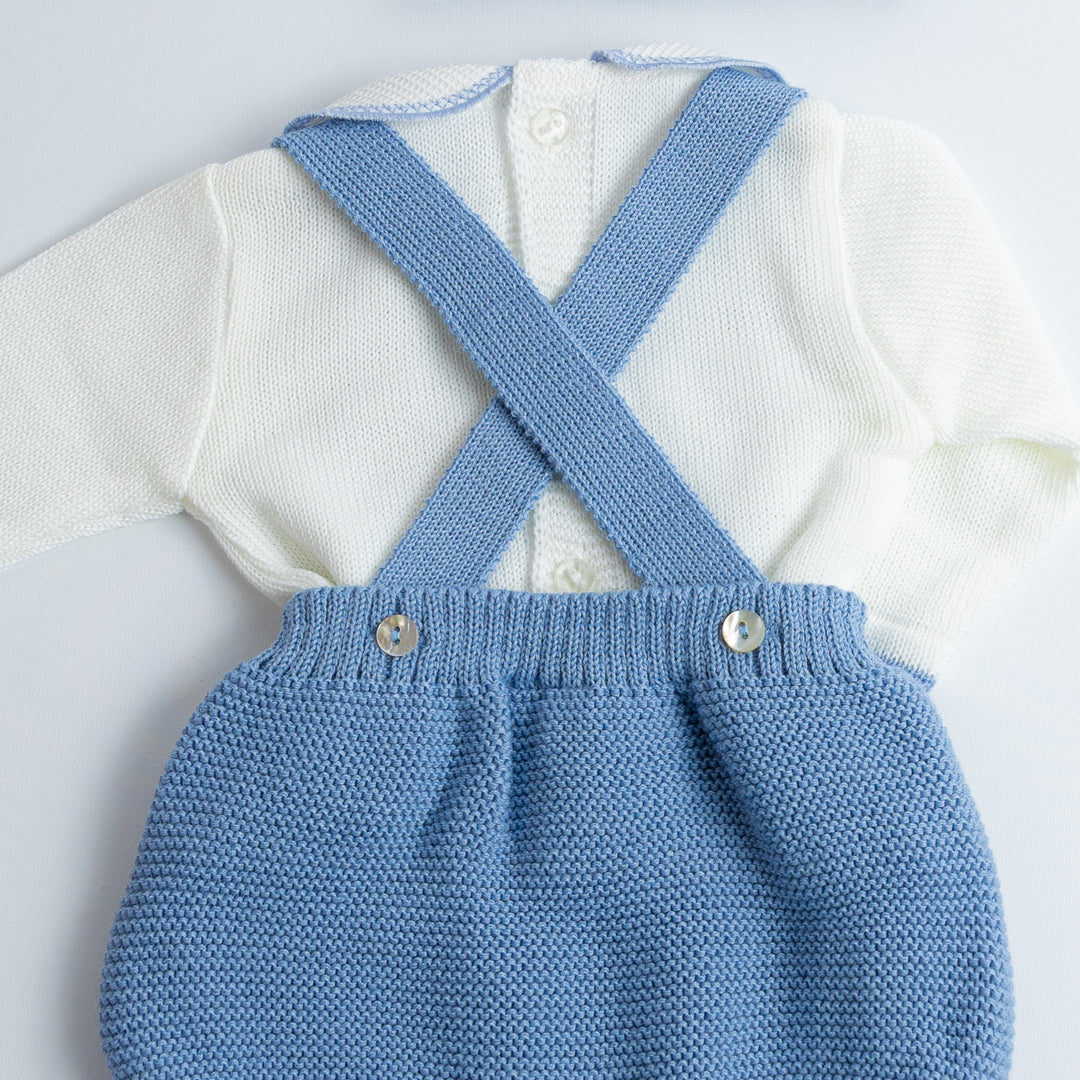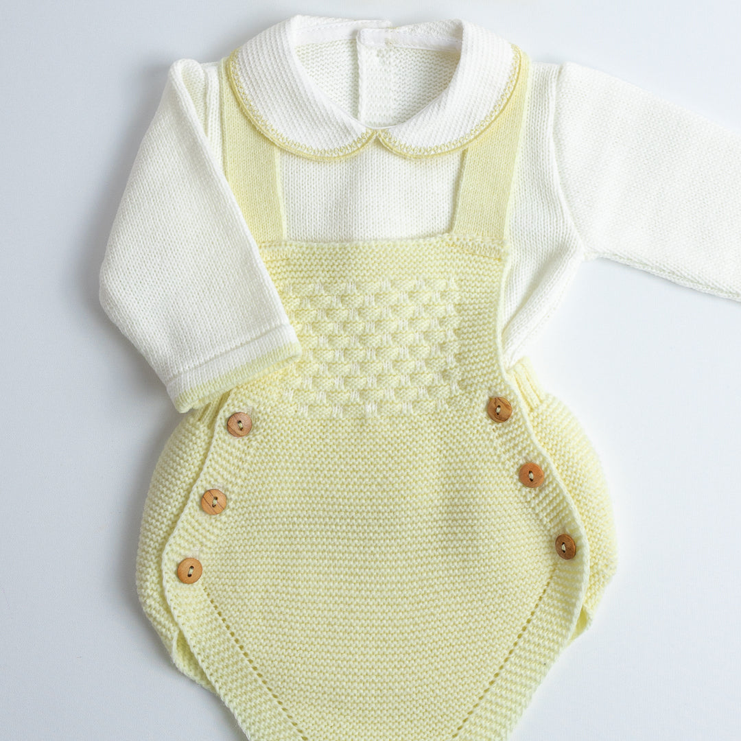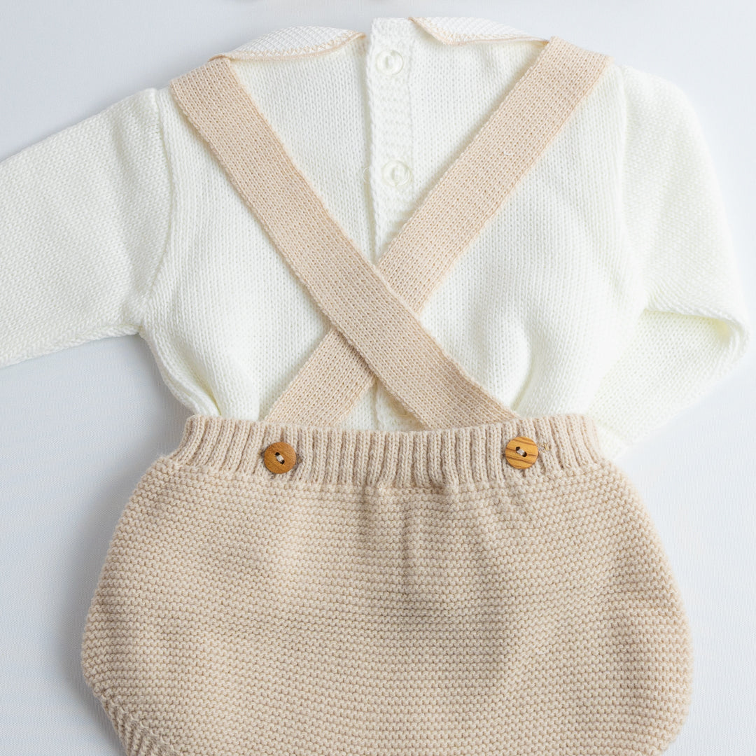 El Set de Ranita Tejida con Blusa "Pequeño Clásico" está diseñado para darle a tu bebé un look distinguido y cómodo. La ranita de tirantes cruzados en la espalda con botones laterales es práctica y fácil de poner, mientras que el jersey de manga larga con cuello bebé aporta el toque clásico de la moda infantil española.
