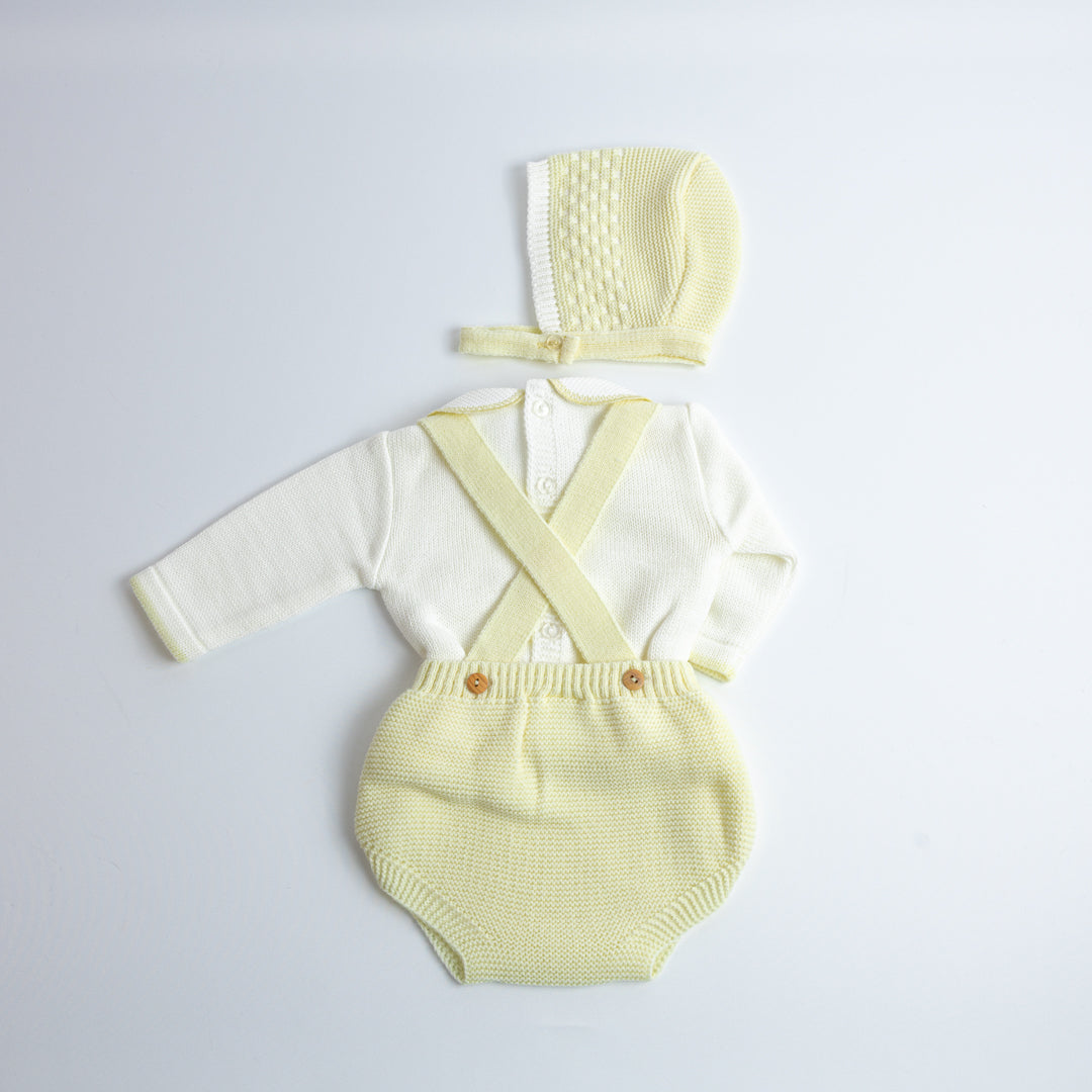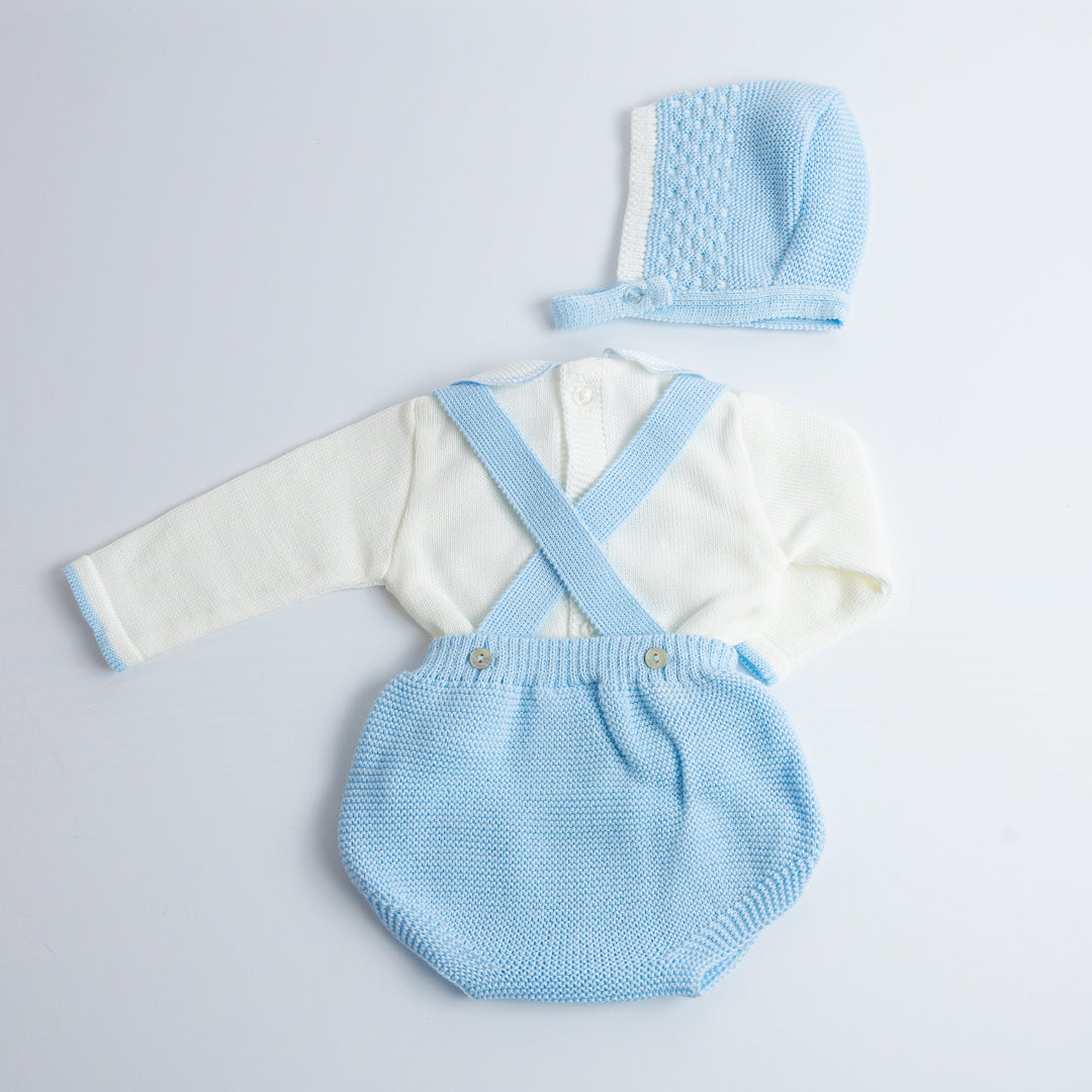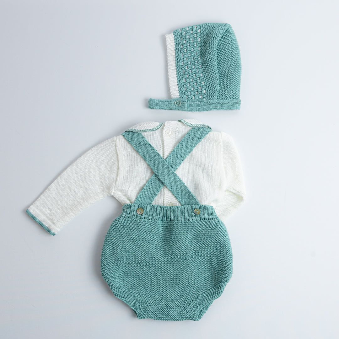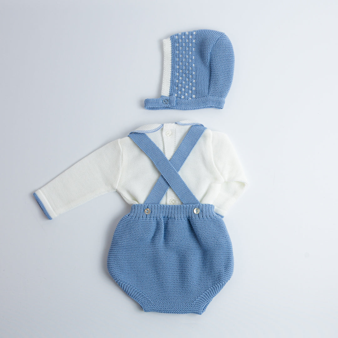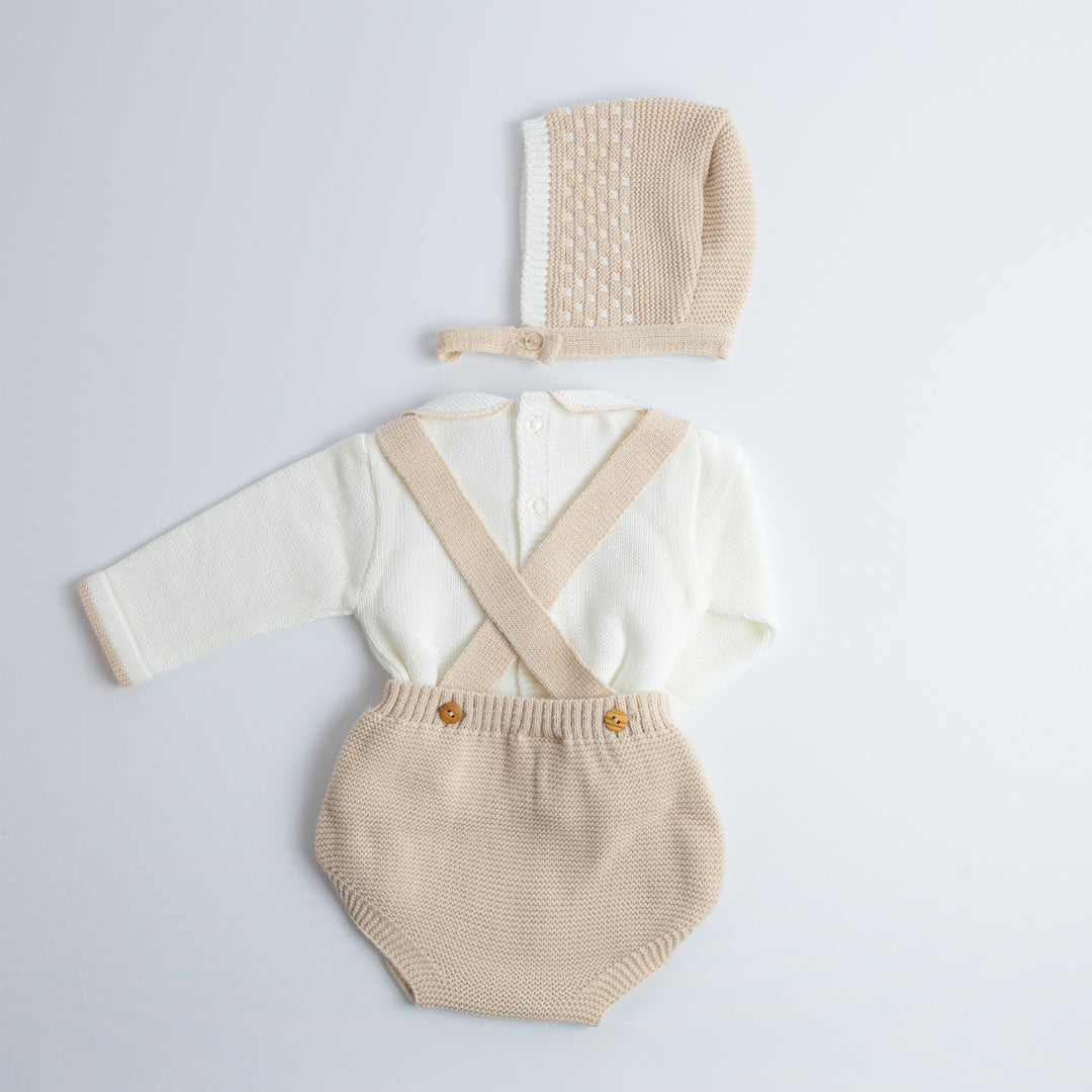 El Set de Ranita Tejida con Blusa "Pequeño Clásico" está diseñado para darle a tu bebé un look distinguido y cómodo. La ranita de tirantes cruzados en la espalda con botones laterales es práctica y fácil de poner, mientras que el jersey de manga larga con cuello bebé aporta el toque clásico de la moda infantil española.