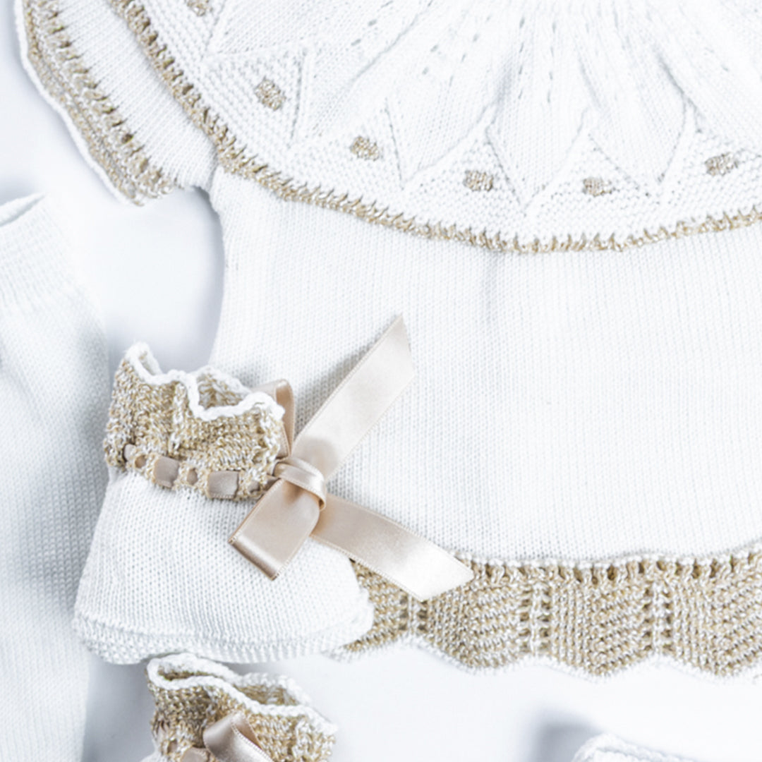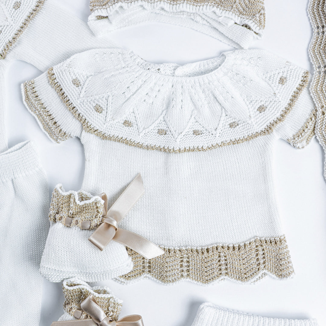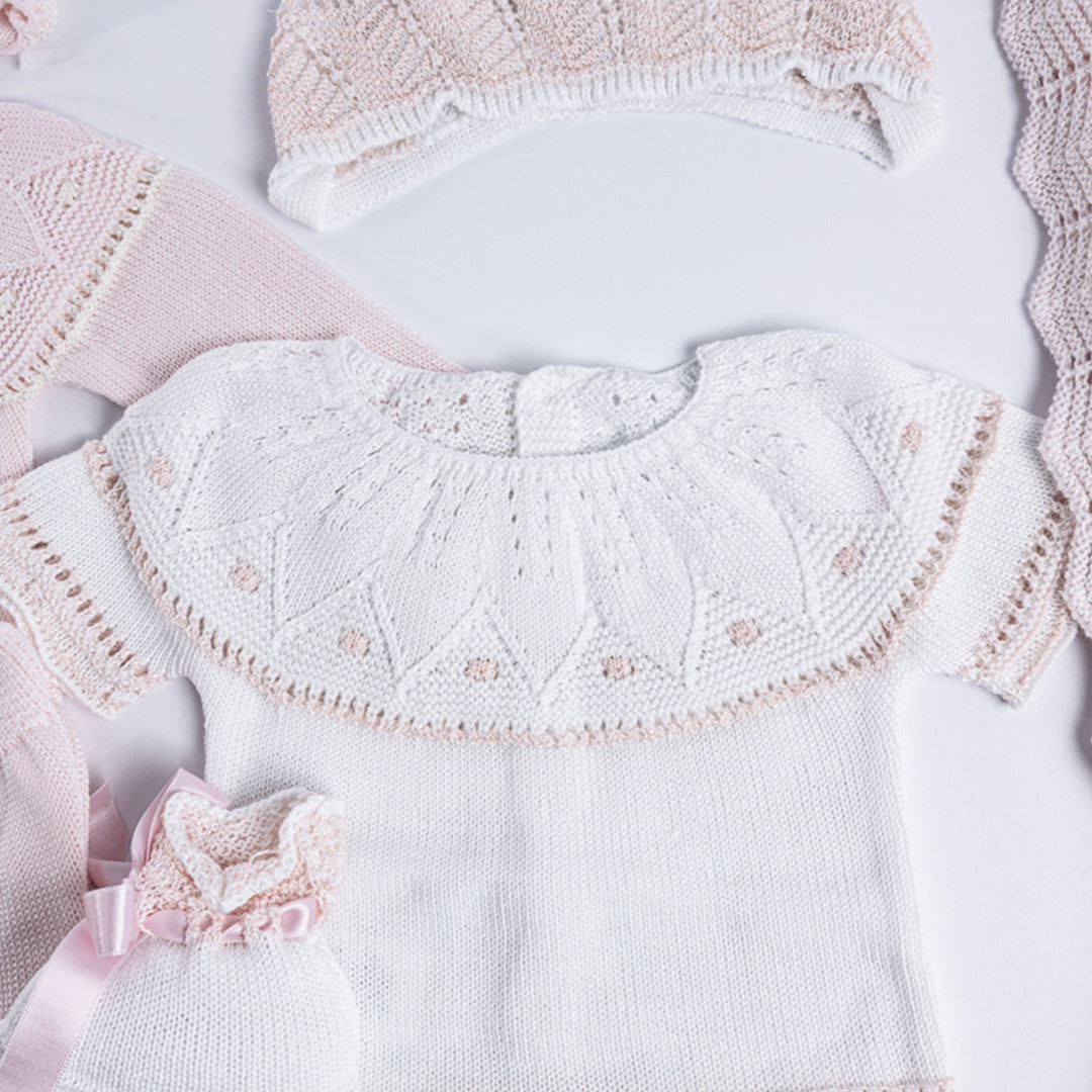 Cada detalle ha sido cuidadosamente elaborado en algodón hipoalergénico, suave y transpirable, ideal para la piel delicada del bebé. Los calados, puntillas y terminaciones reflejan la tradición artesanal española, aportando un estilo único y atemporal.