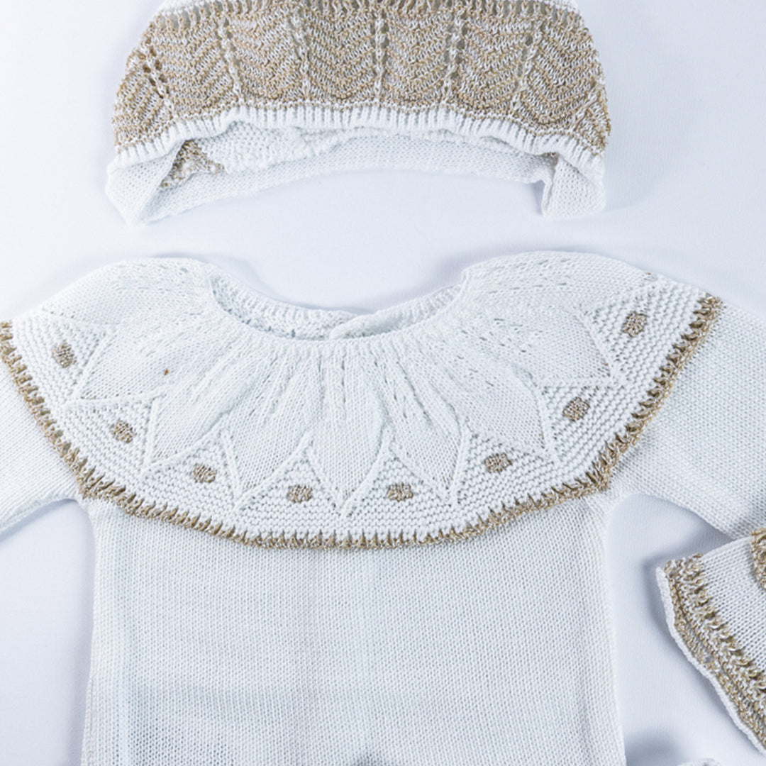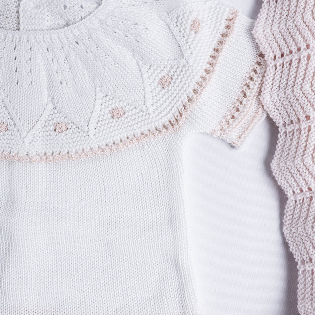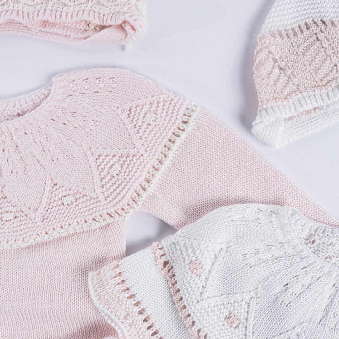 Cada detalle ha sido cuidadosamente elaborado en algodón hipoalergénico, suave y transpirable, ideal para la piel delicada del bebé. Los calados, puntillas y terminaciones reflejan la tradición artesanal española, aportando un estilo único y atemporal.